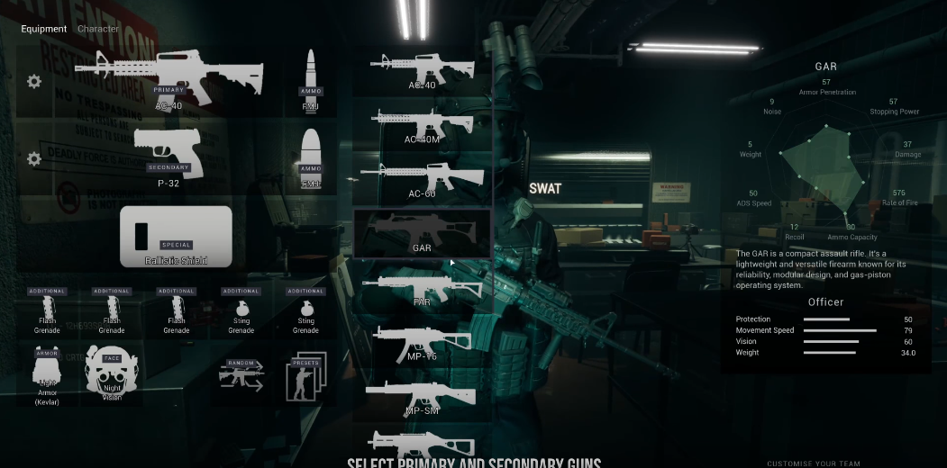 如果没有合适的资源,包括人员和装备,当然无法清除目标。确保你的小队由合适的专家组成,这取决于你想要完成的任务。 – 侦察兵 – 突击队 – 防暴员 – 技术员 – 狙击手 但他们怎么能没有高度专业化的装备?让你的特警使用顶级的物品装备起来,其中有三个不同的类别区分。 武器: – 半自动手枪 – 冲锋枪 – 自动步枪 – 霰弹枪 – 以及一系列的非致命武器 服装: – 战斗服 – 凯夫拉防弹衣 – 防暴盾牌 – 头盔 – 通讯设备 配件: – 手榴弹 – 高能炸药 – 急救措施 – 黑客装置 – 和其他有用的电子小工具