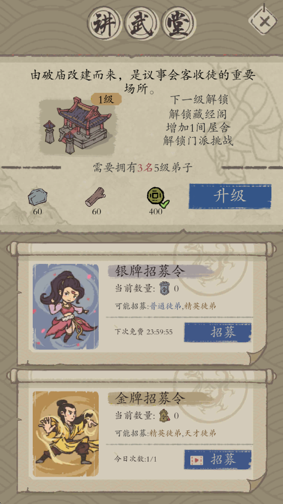 所有要观看的视频都可以跳过,挺休闲的一个游戏,打造宗门,招募弟子,经营门派